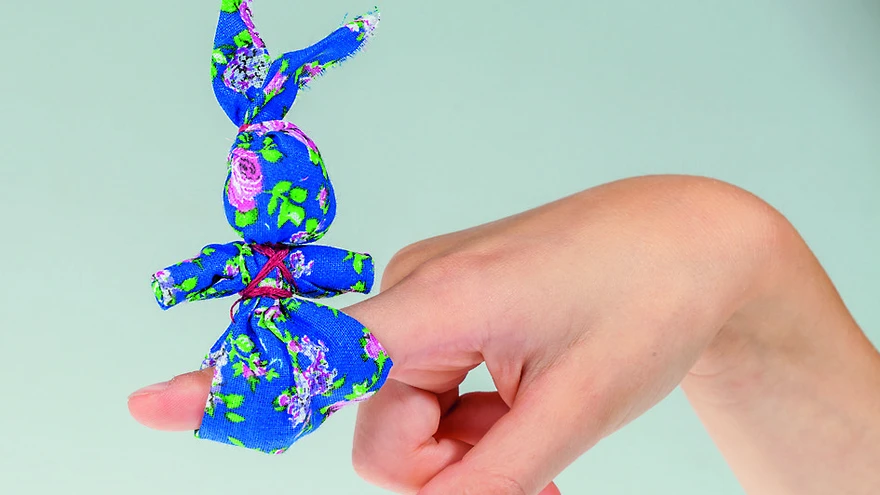Pista jänes näpu otsa ja mäng alaku! Jänkuga mängimiseks pisteti vanasti jänes vasaku käe väikese sõrme otsa, nii jäi ema parem käsi muudeks toimetuseks vabaks. Jänkukese sisse sai peita ka kommi. | foto: Priit GreppÜks näpu otsa käiv riidest jänku valmib 15 minutiga ja kõik vajaminevad materjalid on igas kodus olemas.