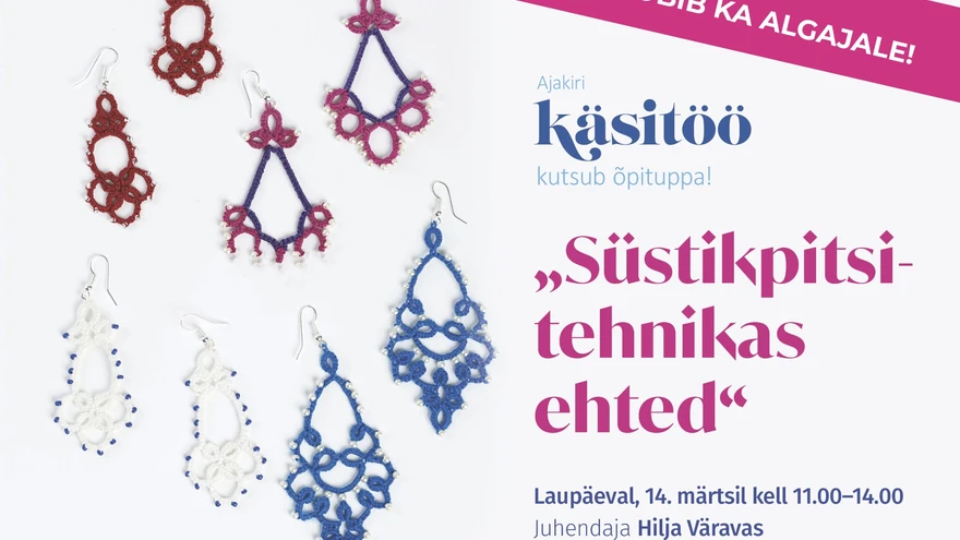 Ajakiri Käsitöö kutsub õpituppa „Süstikpitsitehnikas ehted“. | foto: Ajakiri KäsitööAjakiri Käsitöö kutsub õpituppa „Süstikpitsitehnikas ehted“. Kui tahad õppida selgeks süstikpitsi põhivõtted ning valmistada ka ise väikese ehte, siis on see õpituba just sinu jaoks! Töötuba sobib ka algajatele!