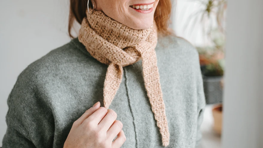 Kitsas sall keri kahekordselt ümber kaela. | foto: Andra Standberg / Strandberg.VisualsKudumismaailmas on väga moes pikad kitsad sallid, aga selliseid salle võiks ju ka heegeldada.