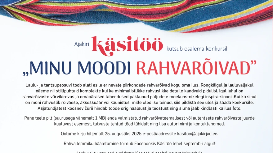 Igal juhul on rahvarõivaste värvikirevus ja omapärased lahendused pakkunud paljudele moekunstnikelegi inspiratsiooni. Kui ka sinul on mõni rahvuslik rõivaese, aksessuaar või kaunistus, mille oled ise teinud, siis pildista see üles ja saada konkursile. Oma ala spetsialistidest koosnev žürii hindab tööde originaalsust ja teostust ning silma jääb kindlasti ka ilus foto.