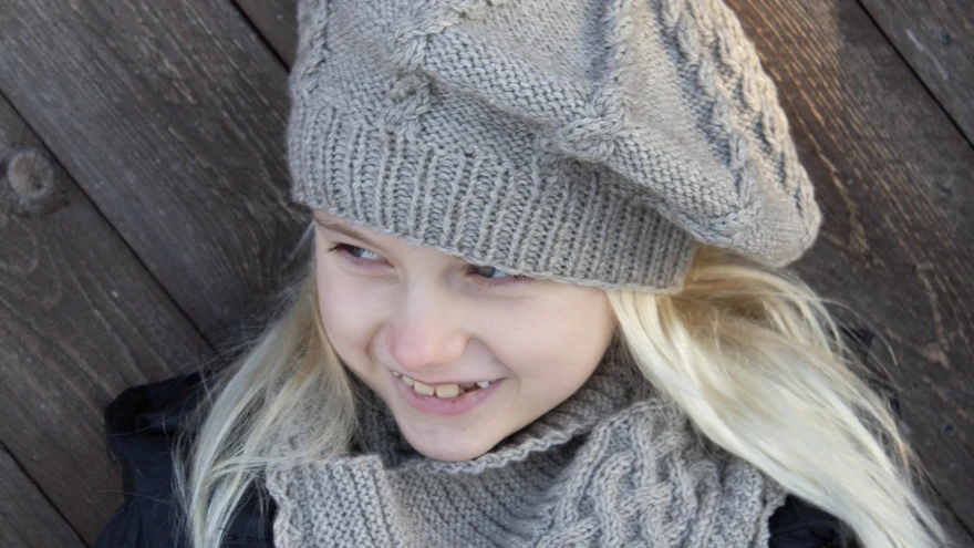 Komplekti kuuluvad kaelussall, müts, kätised ja säärised | foto: Laura KarroErinevate palmikutega kujundatud aksessuaarid on kõik samast lõngast ja moodustavad kena komplekti. Neutraalne toon sobib ka värviliste õueriietega.