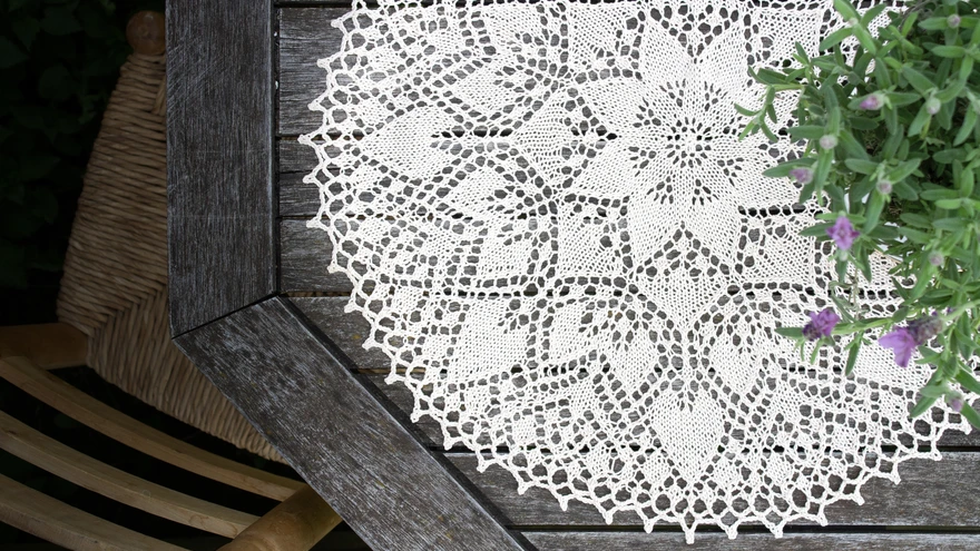 Ringselt kootud lina | foto: Laura KarroSuvise aiapeo lahutamatu kaaslane on linikuga kaunistatud kohvilaud. Liniku valmistamiseks proovi lille- ja lehemustriline uhke linik ringselt heegeldamise asemel hoopis ringselt kududa.