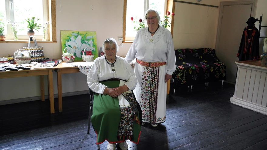 Käsitöö ühendab. Lembi Tani (seisab) koos Maret Saarega 2023. aasta juunis, käsitööringis valminud Mulgi mustritega kirjatud põlled ja omaõmmeldud rahvarõivakomplektid seljas. | foto: erakoguKäsitöö on Mulgi vallas olnud alati au sees ning seda tõestab ka käsitöömeister Lembi Tani, kes on olnud maast madalast tihedalt näputööga seotud. Uue-Kariste käsitööringi juhendajana on ettevõtlik naine innustanud ka kohalikke oma kätega midagi tegema.