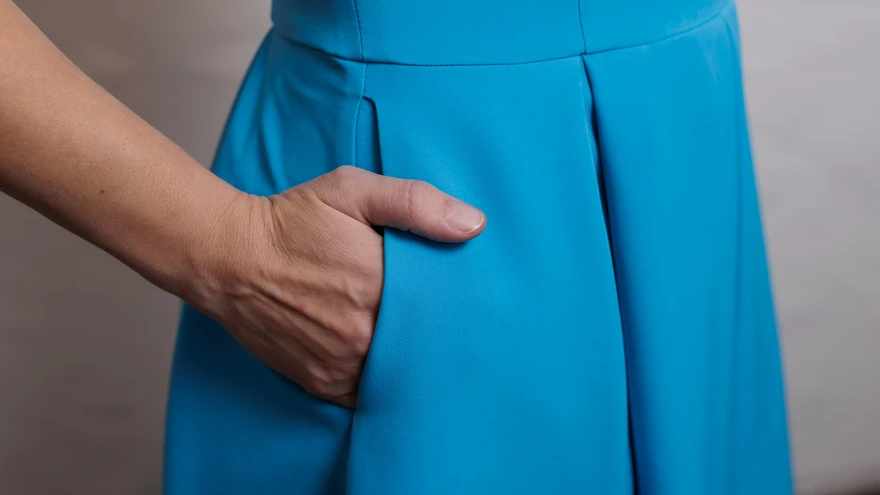 Ühendusõmblusesse õmmeldud taskuAutor: Kristiina Nemirovitš-DantšenkoModell: Nele | foto: TIINA KÕRTSINIÜhendusõmblusesse õmmeldud taskud võivad olla küljeõmblustes või esiosa ühendusõmblustes. Sellised taskud on lihtsad ja rõiva paremal poolel nähtamatud, kuigi samas võib taskuava kaunistada just nimme läbi tikkides.