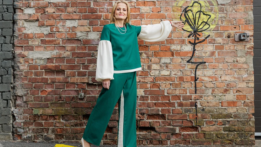 Villane pükskostüüm „Tuul jalgades“Idee: Kätli Saarkoppel & JuurpärimusTeostus: Gitta TruusModell: KätliIdee autor on ühtlasi modellMeik ja soeng: Make Up by Mika | foto: TIINA KÕRTSINIPõneva lahendusega pluusil on varrukad kroogitud, mis annab neile toreda kellukeselõike. Krae ja varruka otste kantimiseks kasutatud lilleline kangas lisab üldmuljele särtsu. Nöörkinnitusega püksid on parajalt lohvakad, andes nii kandjale ülima mugavustunde. Kostüümikangast pükstega sobib otse töölt ka teatrisse, kontserdile või pidulikule õhtusöögile rutata.