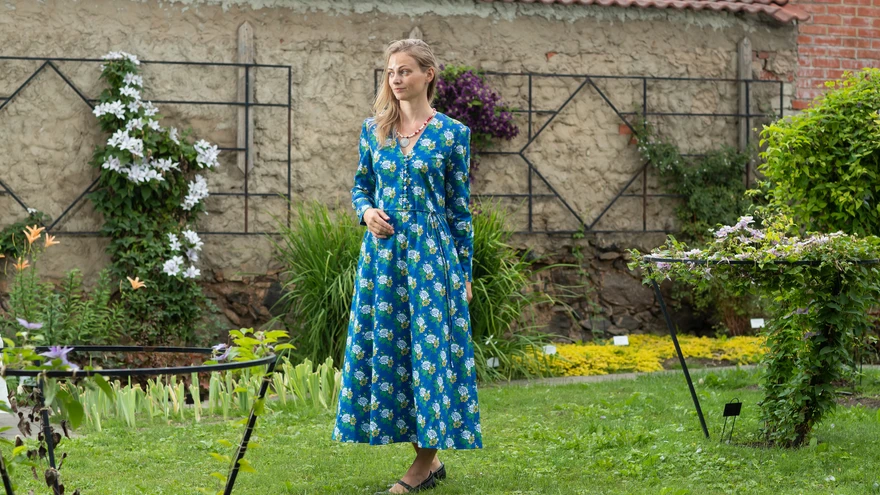 Kanganööpide ja ajastupärase kangaga kleit | foto: Aldo LuudSajandivanused trükikangad inspireerivad kangavalmistajaid. Need lopsakad roosikimbud puuvillasatiinist kleidikangal on laenatud Muhu põlledelt.