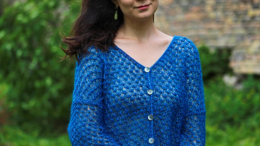 Merekarbimustriline kardiganAutor: Helena Tikunova, Helena Tikunova DesignModell: Polina | foto: Rasuolė BaliukonytėMummulist pitsimustrit meenutava kardigani kudumisel on kasutatud ka Haapsalu salli lõnga. Mohääri ja siidi seguga lõng annab kudumile pehmust.