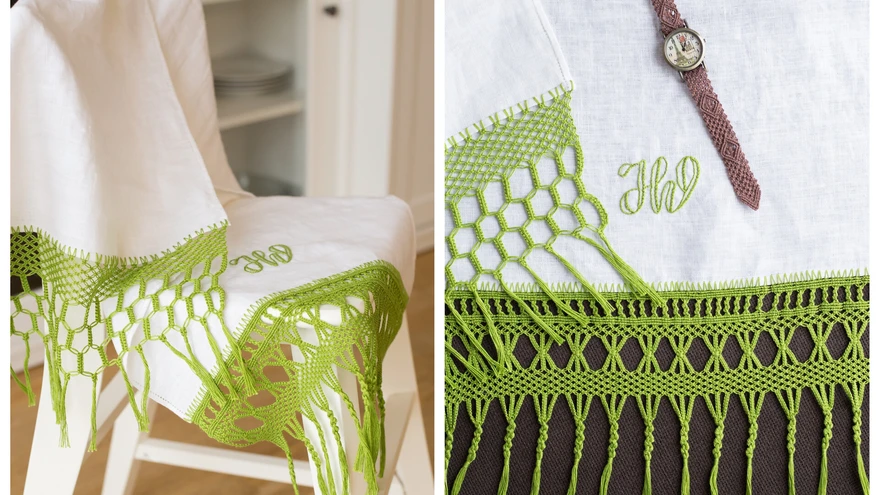 Makrameetehnikas äärepits ja kellarihm. Autor: Hilja Väravas | foto: Marika OhhaMakramee on väga populaarne. Klassikalisi makrameesõlmi kasutades saab valmistada ka õrnu pitse ja miks mitte ka pilkupüüdva kellarihma.