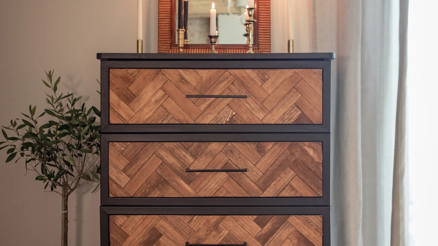 Kalasabamustriga sokisahtel | foto: Älis HeinlehtKellel meist ei oleks elamises praktilist, aga mitte just kõige ilusama välimusega kappi? Kui sahtlid liiguvad ning mööblitüki konstruktsioon on tugev, valmista kapile kalasabamustriga paneelid ja uus moodne kummut ongi sündinud.