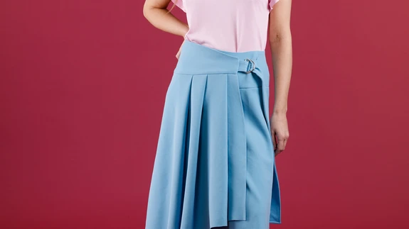 Selles kleidis on kombineeritud lustakate voltidega seelikuosa ja väljapeetud klassikaline kaelus. Vali õmblemiseks pehme ja soe kostüümikangas....